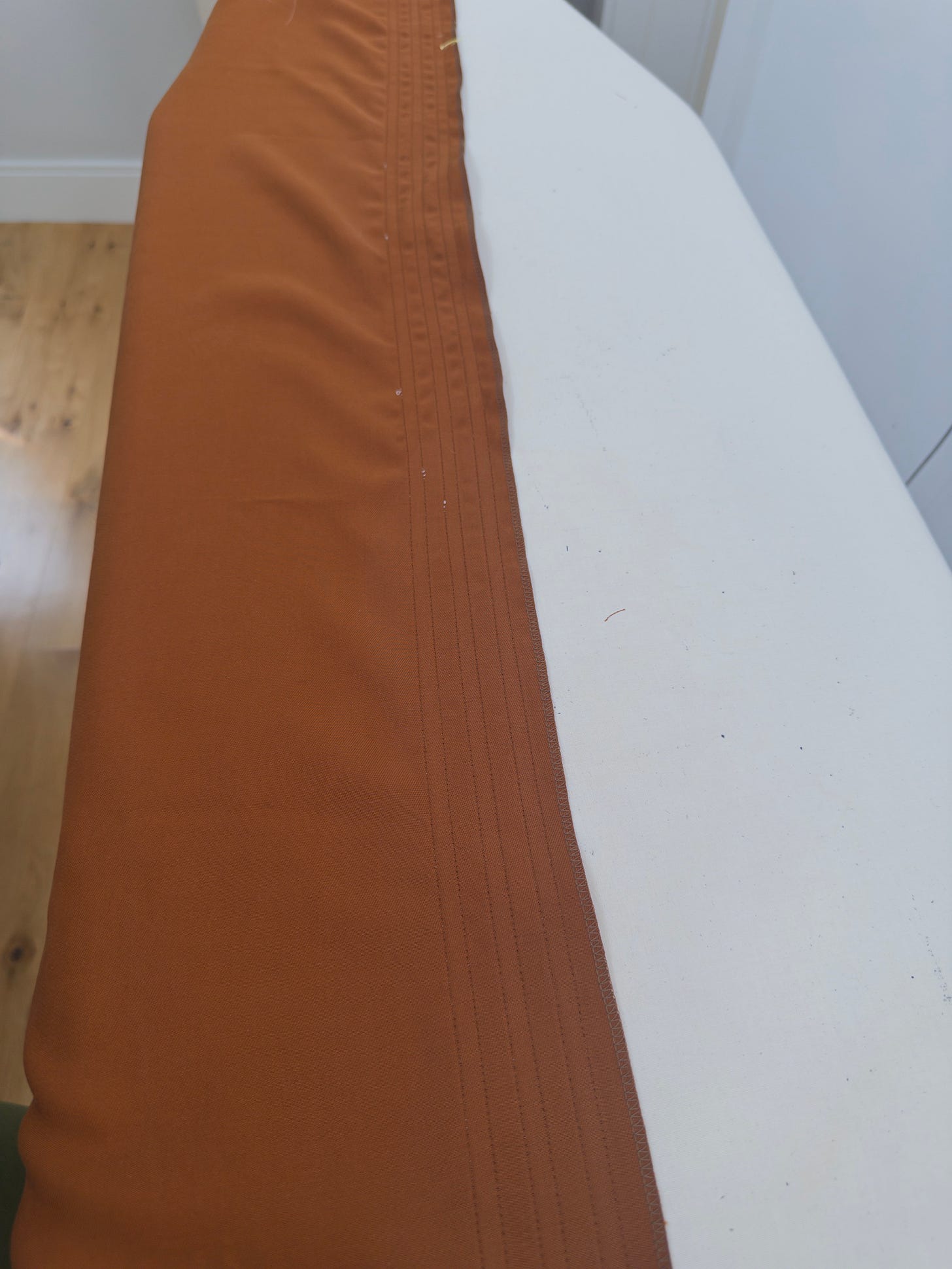 For a pair of flowy track pants in a lyocell twill, I made a 5” sample testing sewing on a ribbon stripe. It looked great on the swatch, but once three rows were extended down the length of the pant, it ruined the drape of the entire leg.