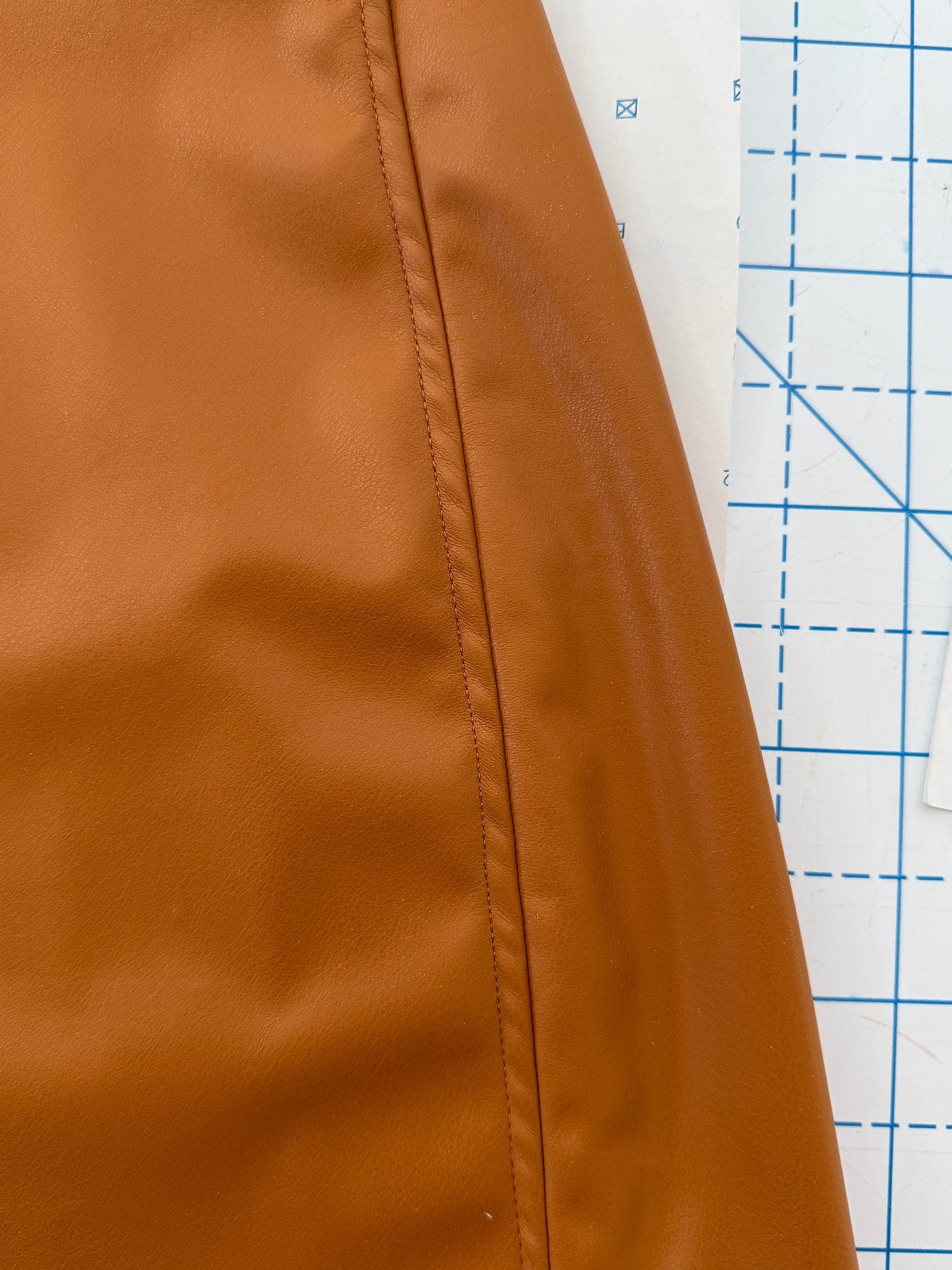 With the faux leather skirt, I made topstitching samples to test the best method (a Teflon foot, longer stitch length, and decreased presser foot pressure). It looked perfect while stitching, but only after the entire seam was topstitched did it reveal pulled fabric. This is where the stretch and the faux leather application of this material became a problem.